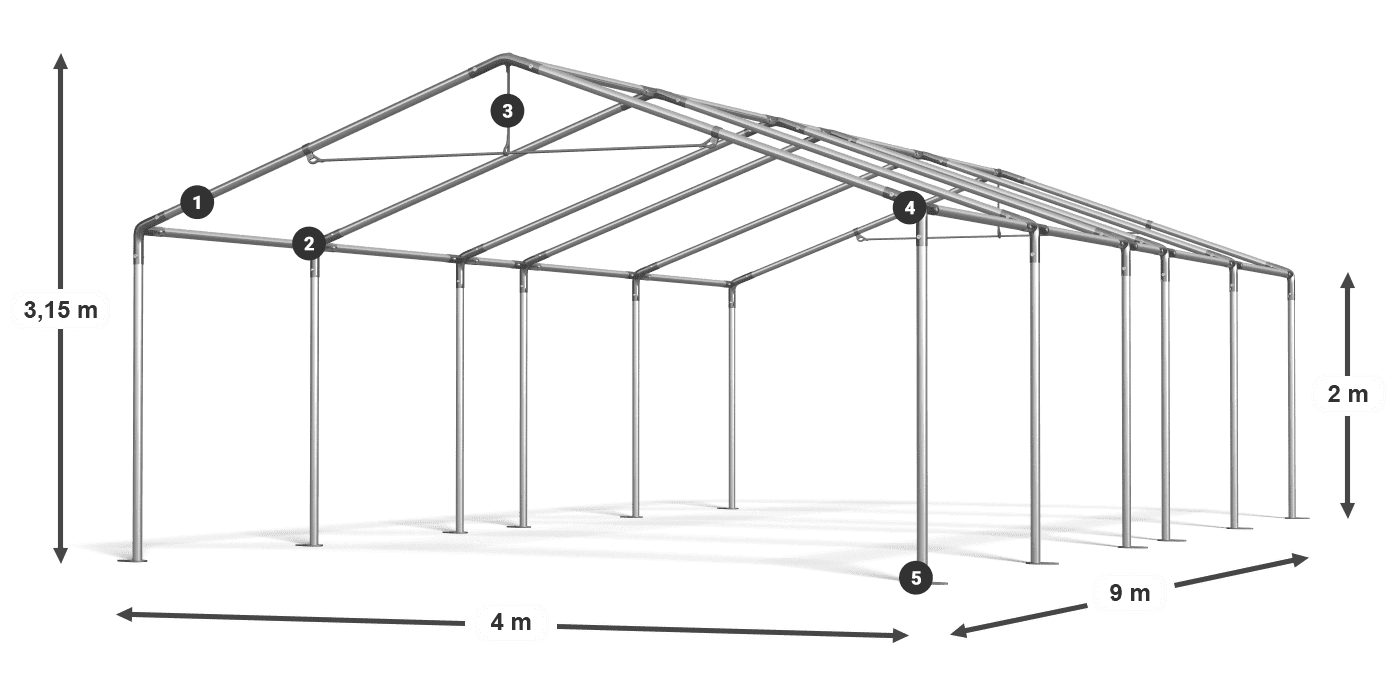 Plná plachta vyrobená zo silných a trvanlivých PVC chráni tovar uložený v skladovacom stane. Oplachovanie je vodotesné, pevné a odolné voči UV žiareniu. V hale stanu môžeme skladovať stavebné materiály, suroviny, športové vybavenie a dokonca aj vozidlá. Zastrešenie nemá žiadne okná, a preto chráni obsah garážového stanu pred očami okoloidúcich. Plarpaulín má systém rýchlej zmeny dĺžky Multi-size.