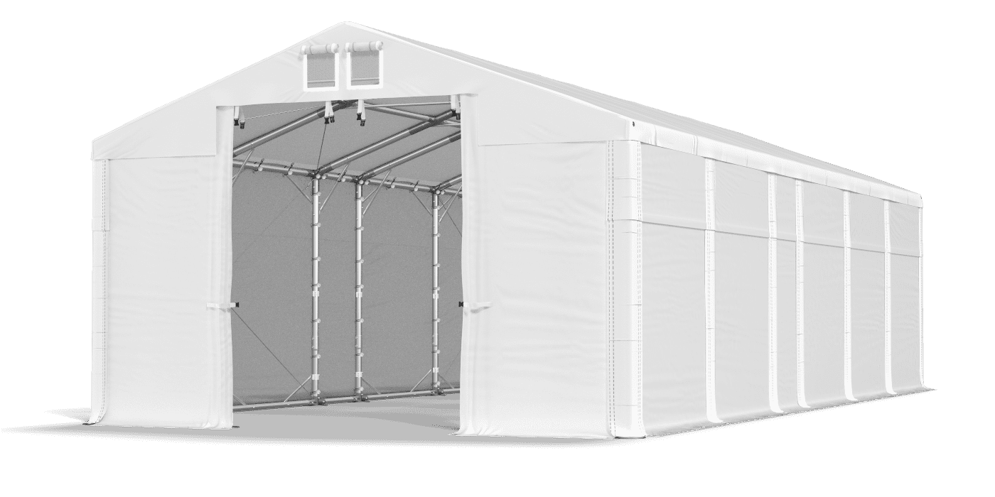 Odolný, tvrdý -tArpaulin tarpaulín z PVC poskytuje bezpečné podmienky na skladovanie stavebných materiálov, komerčných tovarov, vozidiel a poľnohospodárskych strojov. Plné opláštenie bez okien je mimoriadne tesné, vodotesné a neprechádza denným svetlom. Interiér skladového stanu je pre okoloidúci neviditeľný. Jedná sa o vynikajúci garážový stan a priemyselnú sieň. Plarpaulín má systém rýchlej zmeny dĺžky Multi-size.