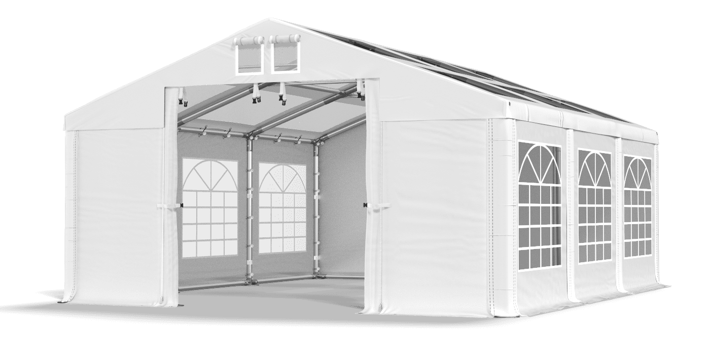 Ohýbanie okien s farebným sklom vyzerá elegantne a funguje skvele pri organizovaní rodinných a obchodných vonkajších večierkov. Priehľadná strecha zaručuje úplné osvetlenie stolov a buffínov. Plarka je plne odolná voči vlhkosti a UV žiareniu. Vďaka tomu zostáva interiér stanu večierku suchý. Oplachovanie bolo vybavené systémom ľahkej zmeny dĺžky Multi-size. Je to tiež vynikajúci záhradný stan a výstavný stan.