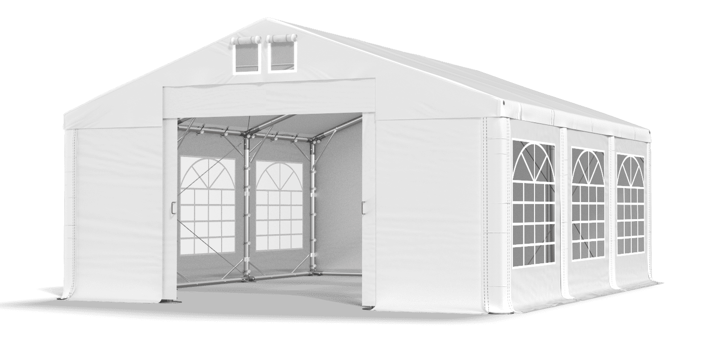 „Pevná plachta s oknami z farebného skla je vyrobená z vysokej hmotnosti PVC Služovanie je vodotesné a odolné voči UV žiareniu. Target stanu strany poskytuje suchý a tienistý priestor pre stoly, bufety a tanečný parket. „