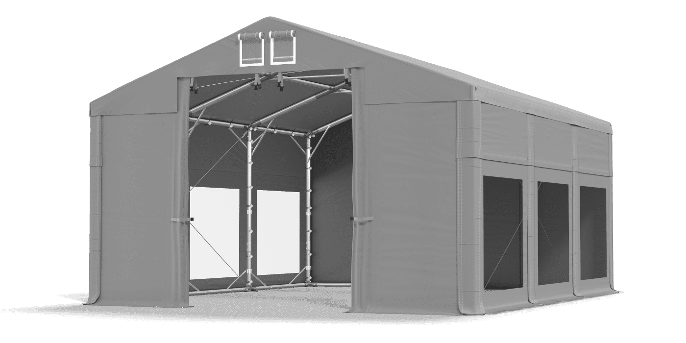 Strešný a bočný napínací systém pozostáva z hrubých oceľových lán s napínačmi. Výsledkom je extrémne odolná konštrukcia, ktorá sa nedeformuje a zostáva kompaktná počas celej doby používania.