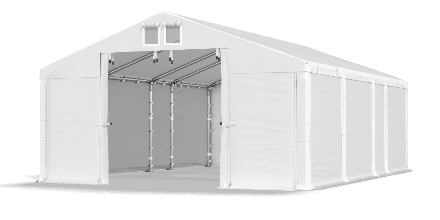 Úplná a odolná plachta od PVC poskytuje bezpečný priestor na ukladanie tovaru, garačné vozidlá a skladovanie plodín. Pod strechou môžeme udržiavať stavebné materiály, suroviny, záhradný nábytok a športové vybavenie. Oplachovanie je vodotesné, pevné a odolné voči UV žiareniu. Bočné steny sa navzájom dokonale priľnú a nemajú okná, a preto je interiér úložného stanu neviditeľný zvonku. Plarka je vybavená systémom ľahkej zmeny dĺžky Multi-size.