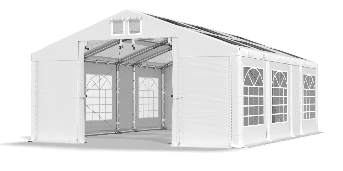 Plarka vybavenovaná oknami vitráže a priehľadnou strechou zaisťuje optimálne osvetlenie stolov a bufetov počas večierkov v večierku. Silné opláštenie s PVC chráni pred vlhkosťou, vetrom a UV žiarením. V prípade stanu môžete organizovať rodinné oslavy, bankety spoločnosti, festivaly a výstavy. Je to tiež vynikajúci záhradný stan a komerčný stan. Oplachovanie bolo vybavené systémom ľahkej zmeny dĺžky Multi-size.