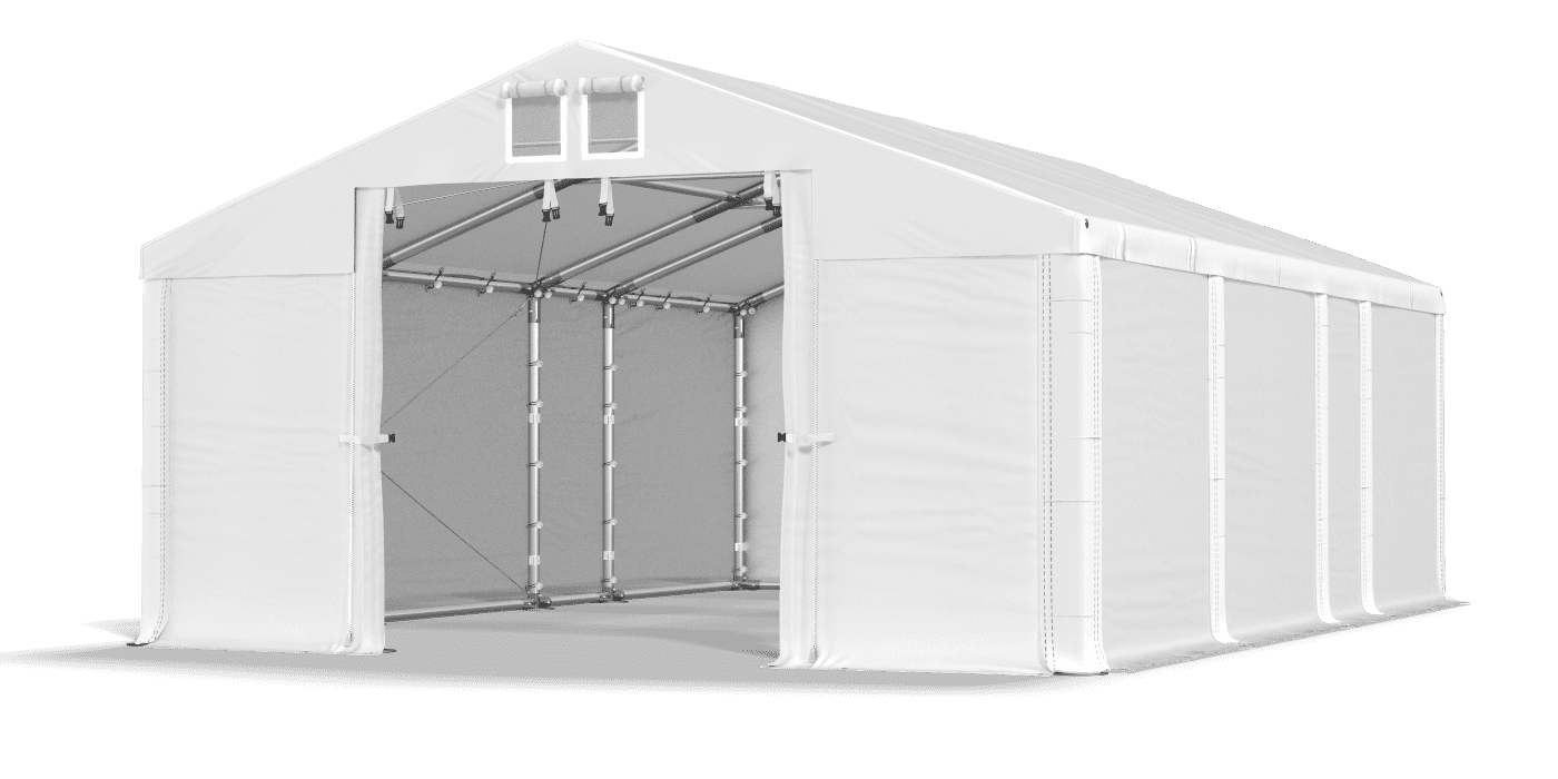 Plné opláchnutie vyrobené z PVC s vysokou hmotnosťou zaručte perfektný úložný priestor pre komerčné tovary, stavebné materiály, plodiny a poľnohospodárske stroje. Plarka bez okien je veľmi tesná a neprechádza denným svetlom. Preto je interiér garážového stanu neviditeľný pre okoloidúci. Dvojité ventilátory regulujú výmenu vzduchu a poskytujú pohodlné pracovné podmienky. Oplachovanie je vodotesné a odolné voči UV žiareniu. Okrem toho má systém Multi-size, ktorý vám umožňuje rýchlo zmeniť dĺžku skladového stanu.