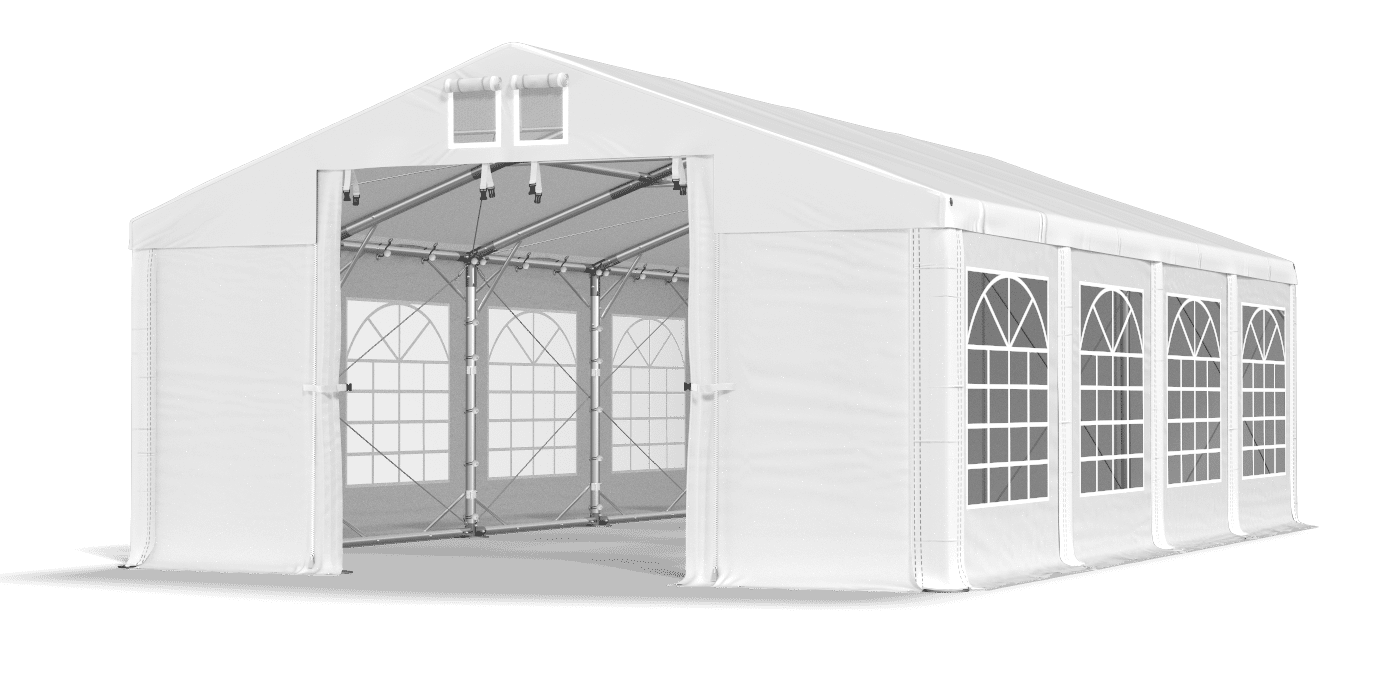 Odolný plachta s oknami z farebného skla chráni stoly a bufety pred vlhkosťou, vetrom a UV žiarením. Ohýbanie je vyrobené zo silného PVC. Elegantné okná z farebného skla sú dekoráciou večierkového stanu a tiež poskytujú veľa prirodzeného svetla. Bleskové opláštenie zvyšuje bezpečnosť pri použití stanu na gastronomické a stravovacie účely. Plarpaulín má systém rýchlej zmeny dĺžky Multi-size.