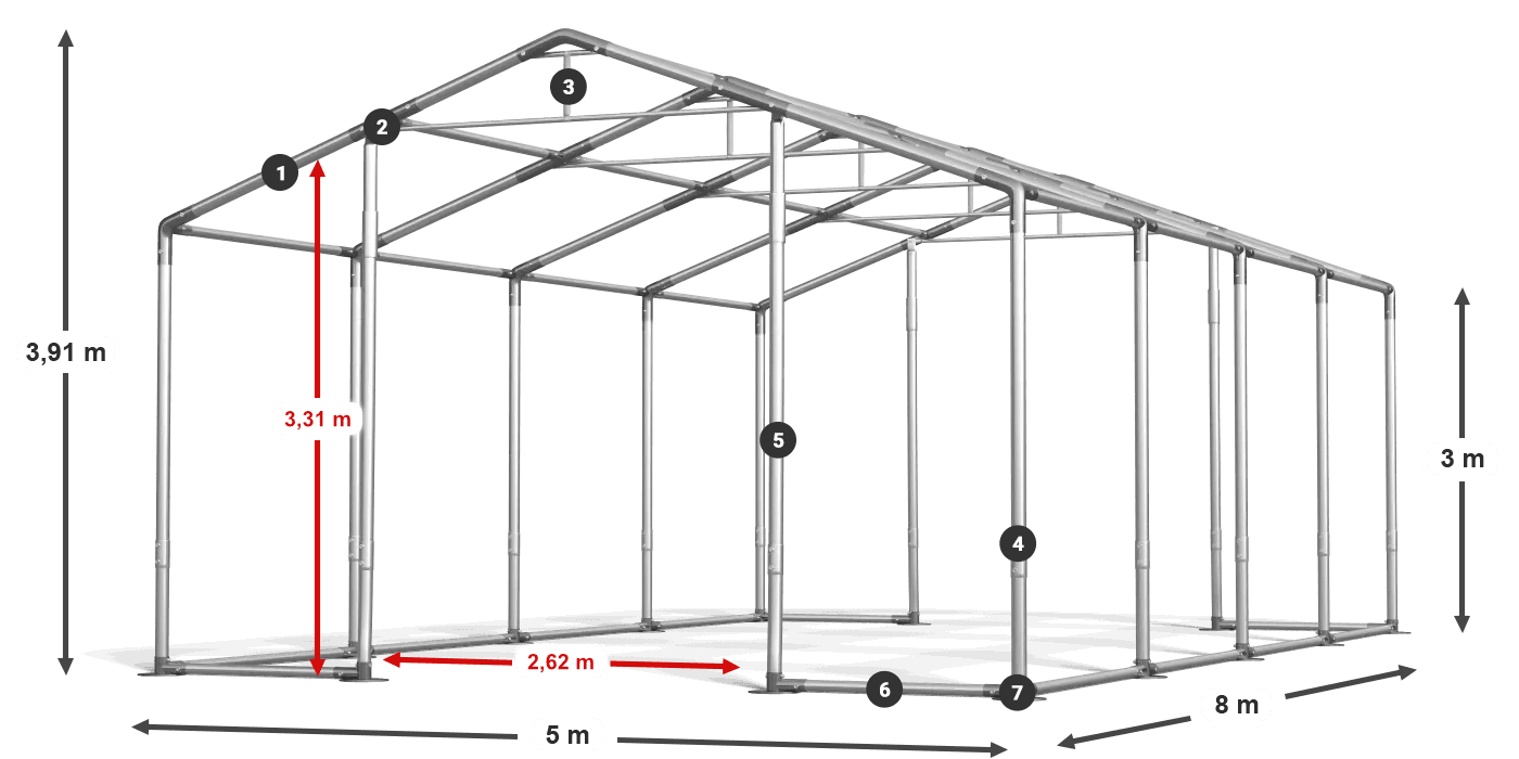 Výšky úložných a párty stanov je možné rýchlo meniť vďaka modulárnej konštrukcii, ktorá umožňuje zdvihnutie stanu o 0,5 m alebo 1 m. Najnižšia možná výška bočnej steny je 2m a najvyššia je 4m.