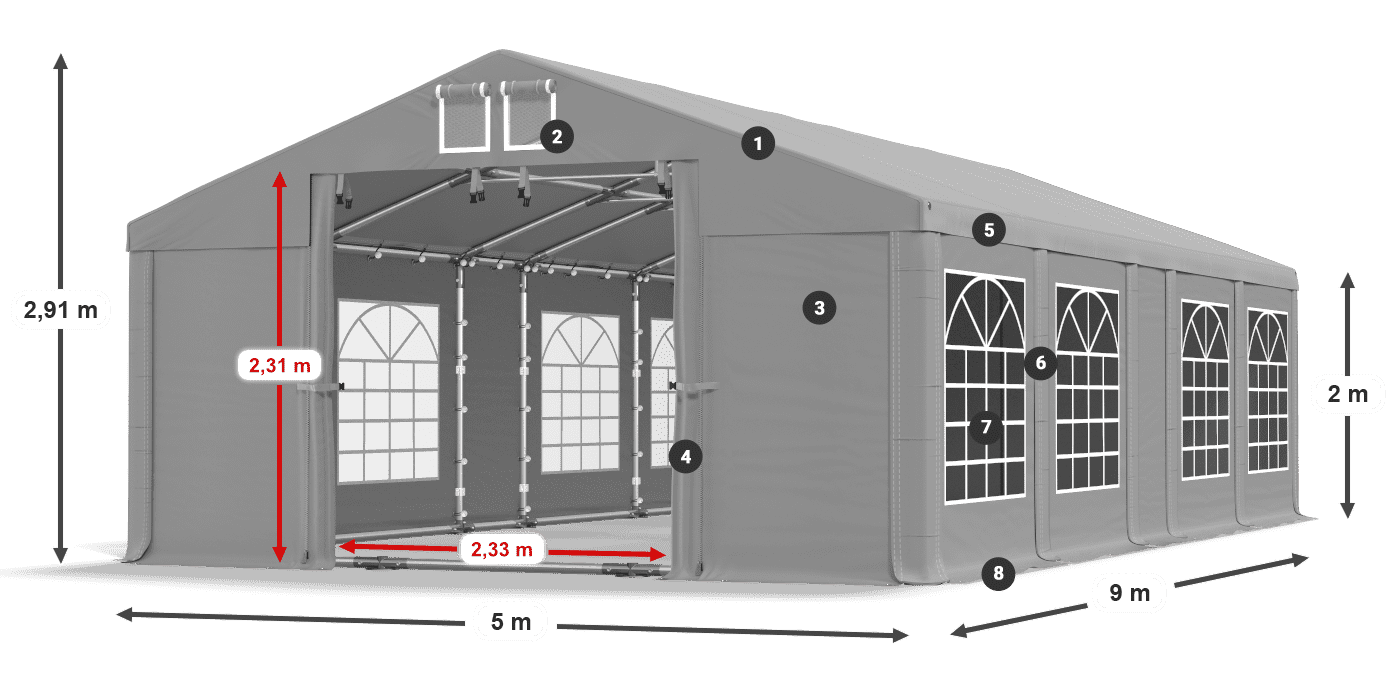 Silné opláštenie s oknami z farebného skla chráni stoly a bufety pred vlhkosťou a vetrom. Utesnená plachta od PVC je odolná voči UV žiareniu, a preto poskytuje suchý a tienistý priestor. V párty stanu môžeme organizovať rodinné večierky, mestské festivaly a spoločnosti spoločnosti. Je to tiež vynikajúci záhradný stan a komerčný stan. Elegantná plachta je vybavená systémom ľahkej zmeny dĺžky Multi-size.