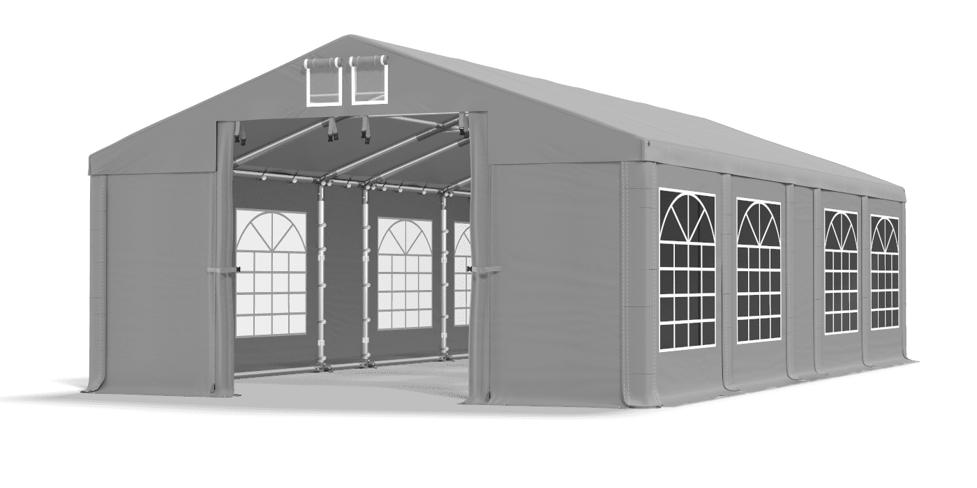 Silné opláštenie s oknami z farebného skla chráni stoly a bufety pred vlhkosťou a vetrom. Utesnená plachta od PVC je odolná voči UV žiareniu, a preto poskytuje suchý a tienistý priestor. V párty stanu môžeme organizovať rodinné večierky, mestské festivaly a spoločnosti spoločnosti. Je to tiež vynikajúci záhradný stan a komerčný stan. Elegantná plachta je vybavená systémom ľahkej zmeny dĺžky Multi-size.