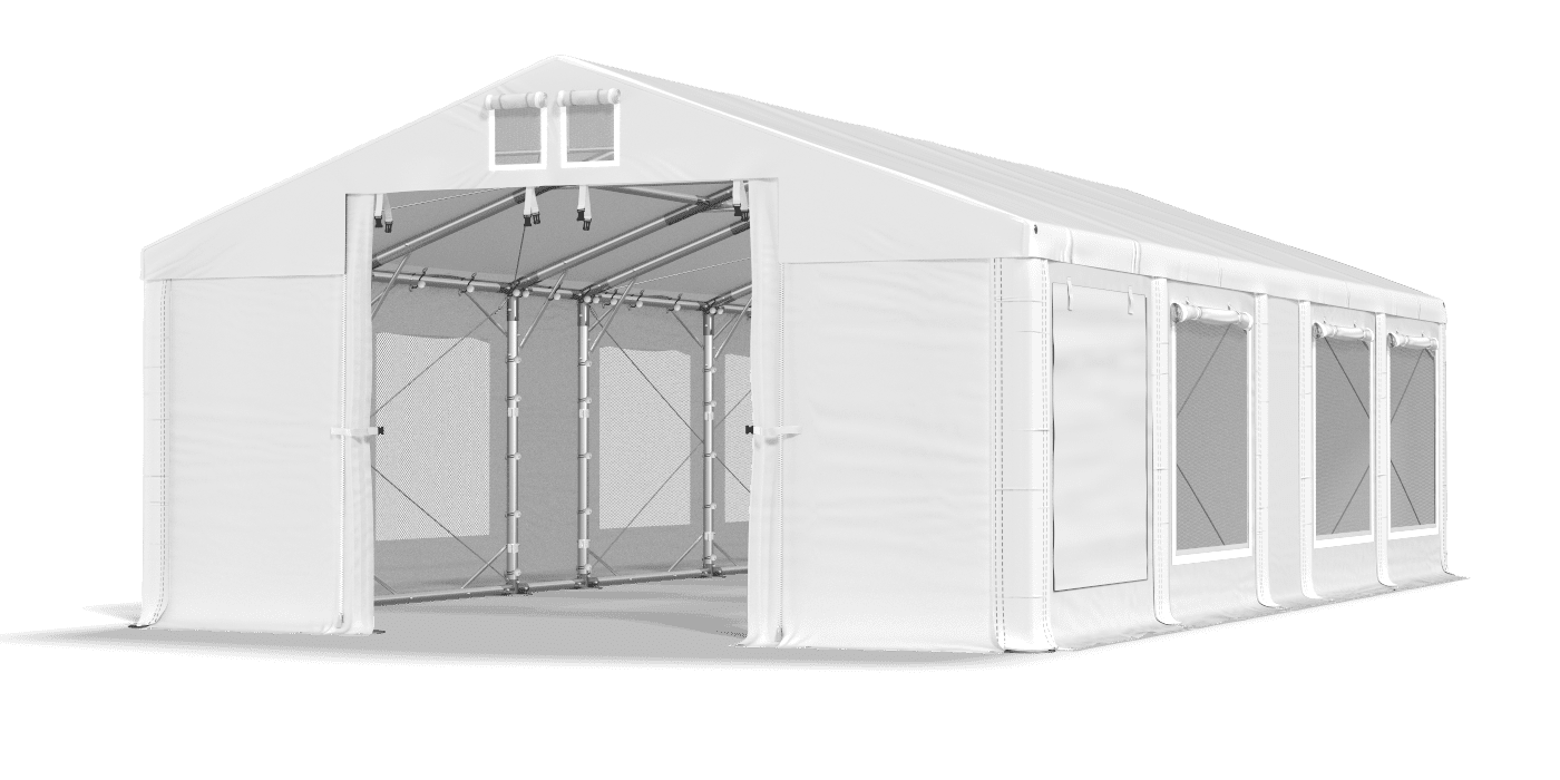 Trvalá plachta od PVC bola vybavená oknami s siete komárom. Je to veľmi priedušné opláštenie, ktoré chráni stoly a bufety pred lietajúcim hmyzom. Plarka je vodotesná a odolná voči UV žiareniu. Je to vynikajúci stan na večierok, ktorý je možné zapečatiť v prípade zhoršenia počasia s rozvinutými žalúziami. Strecha bude tiež dobre fungovať v obchode alebo ako altánok stanu. Plarka je vybavená systémom ľahkej zmeny dĺžky Multi-size.