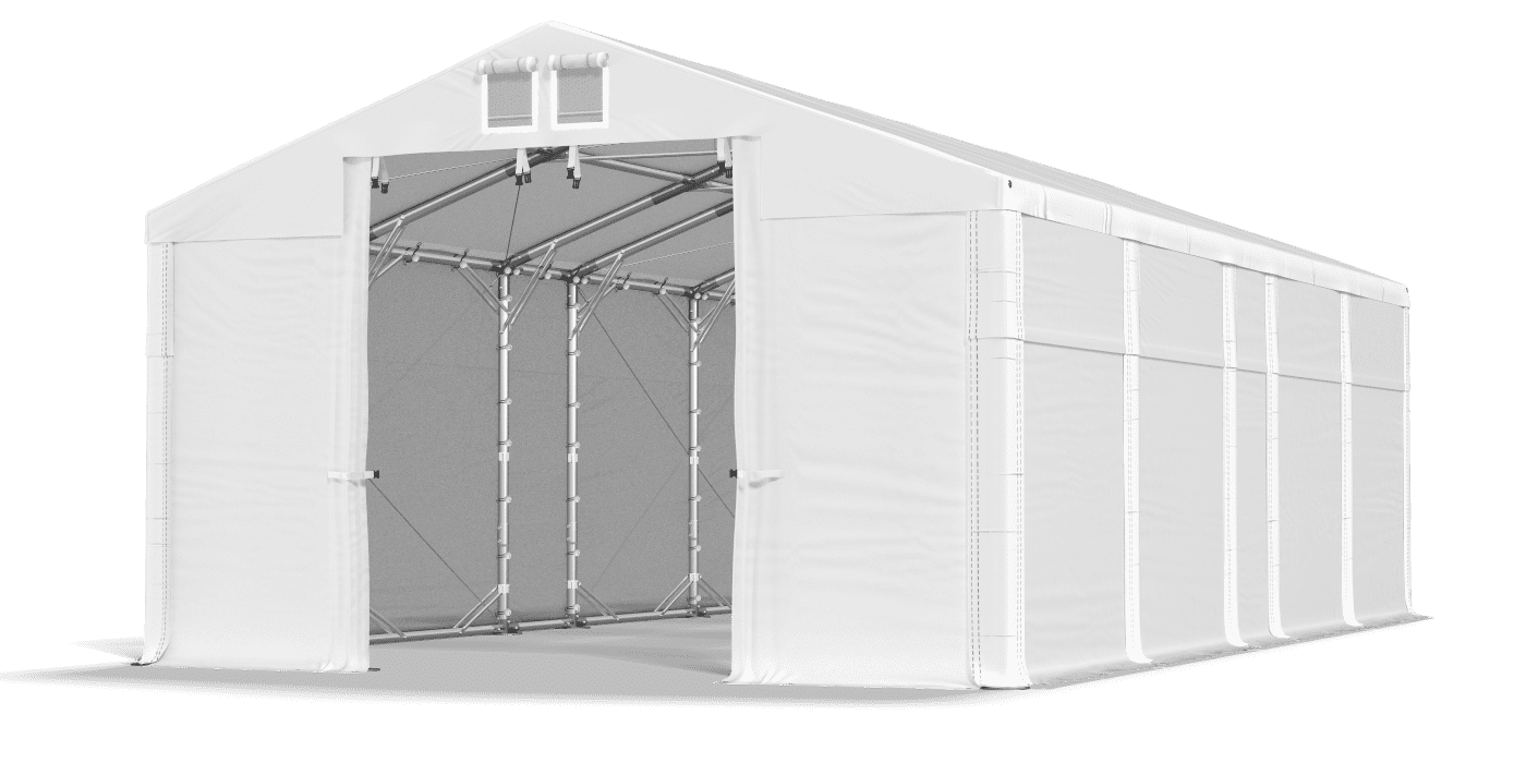 Odolný, tvrdý -tArpaulin tarpaulín z PVC poskytuje bezpečné podmienky na skladovanie stavebných materiálov, komerčných tovarov, vozidiel a poľnohospodárskych strojov. Plné opláštenie bez okien je mimoriadne tesné, vodotesné a neprechádza denným svetlom. Interiér skladového stanu je pre okoloidúci neviditeľný. Jedná sa o vynikajúci garážový stan a priemyselnú sieň. Plarpaulín má systém rýchlej zmeny dĺžky Multi-size.