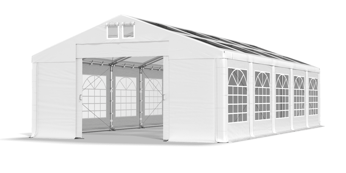 Ohýbanie okien s farebným sklom vyzerá elegantne a funguje skvele pri organizovaní rodinných a obchodných vonkajších večierkov. Priehľadná strecha zaručuje úplné osvetlenie stolov a buffínov. Plarka je plne odolná voči vlhkosti a UV žiareniu. Vďaka tomu zostáva interiér stanu večierku suchý. Oplachovanie bolo vybavené systémom ľahkej zmeny dĺžky Multi-size. Je to tiež vynikajúci záhradný stan a výstavný stan.