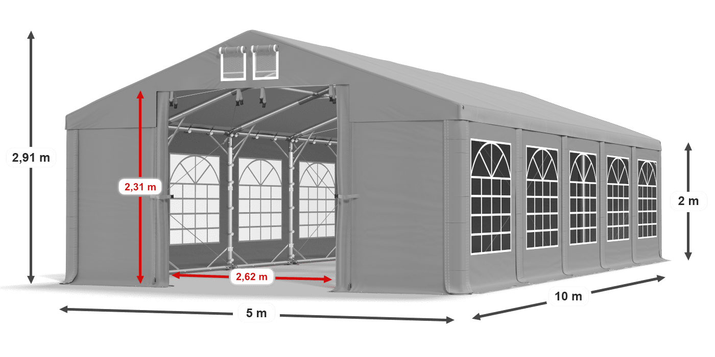 Výšky úložných a párty stanov je možné rýchlo meniť vďaka modulárnej konštrukcii, ktorá umožňuje zdvihnutie stanu o 0,5 m alebo 1 m. Najnižšia možná výška bočnej steny je 2m a najvyššia je 4m.
