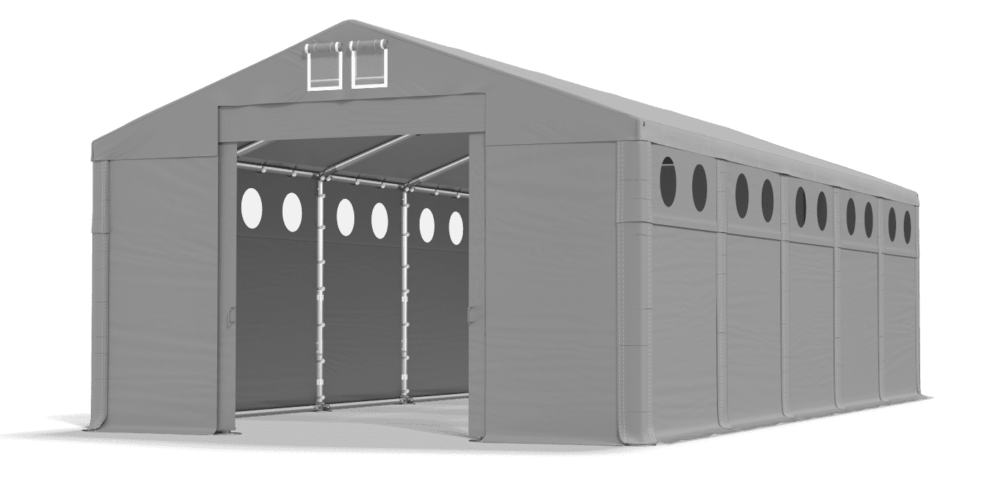 Plarka s okienkami okrúhleho osvetlenia je ideálna na opravy a prácu dielne, pretože poskytuje dodávku prirodzeného denného svetla. Ohýbanie je vyrobené zo silného PVC, čo je odolné voči vlhkosti a UV žiareniu. Malé okná sú umiestnené v hornej časti stien po miestnosti, a preto obmedzujú viditeľnosť interiéru stanu na okoloidúci. Je to vynikajúci úložný stan a garážový stan.