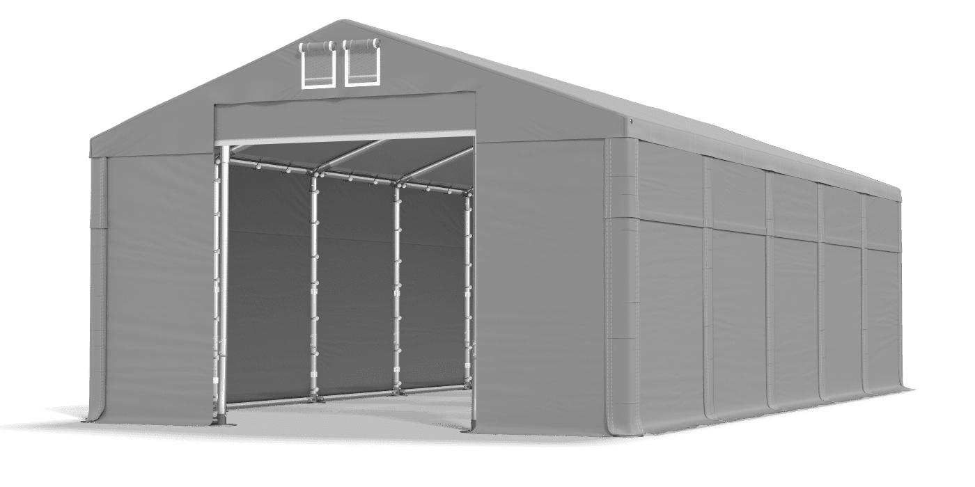 Odolný, tvrdý -tArpaulin tarpaulín z PVC poskytuje bezpečné podmienky na skladovanie stavebných materiálov, komerčných tovarov, vozidiel a poľnohospodárskych strojov. Plné opláštenie bez okien je mimoriadne tesné, vodotesné a neprechádza denným svetlom. Interiér skladového stanu je pre okoloidúci neviditeľný. Jedná sa o vynikajúci garážový stan a priemyselnú sieň. Plarpaulín má systém rýchlej zmeny dĺžky Multi-size.