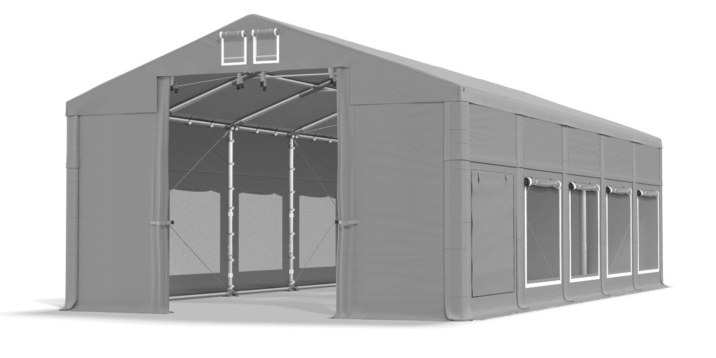 Trvalá plachta od PVC bola vybavená oknami s siete komárom. Je to veľmi priedušné opláštenie, ktoré chráni stoly a bufety pred lietajúcim hmyzom. Plarka je vodotesná a odolná voči UV žiareniu. Je to vynikajúci stan na večierok, ktorý je možné zapečatiť v prípade zhoršenia počasia s rozvinutými žalúziami. Strecha bude tiež dobre fungovať v obchode alebo ako altánok stanu. Plarka je vybavená systémom ľahkej zmeny dĺžky Multi-size.