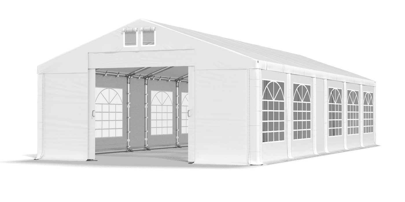 „Pevná plachta s oknami z farebného skla je vyrobená z vysokej hmotnosti PVC Služovanie je vodotesné a odolné voči UV žiareniu. Target stanu strany poskytuje suchý a tienistý priestor pre stoly, bufety a tanečný parket. „