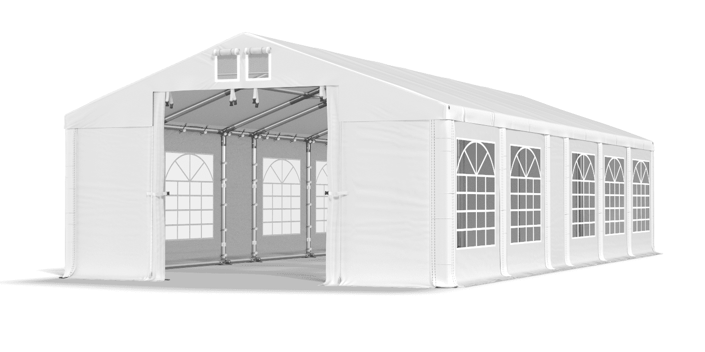 Odolný plachta s oknami z farebného skla chráni stoly a bufety pred vlhkosťou, vetrom a UV žiarením. Ohýbanie je vyrobené zo silného PVC. Elegantné okná z farebného skla sú dekoráciou večierkového stanu a tiež poskytujú veľa prirodzeného svetla. Bleskové opláštenie zvyšuje bezpečnosť pri použití stanu na gastronomické a stravovacie účely. Plarpaulín má systém rýchlej zmeny dĺžky Multi-size.
