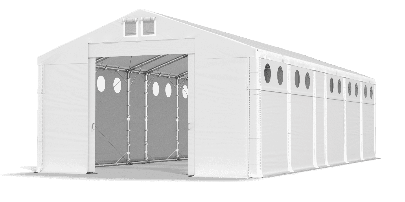 Trvalá plachta od PVC, ktorá je vybavená osvetľovacími oknami, zaručuje dodávku prirodzeného svetla pri práci pod strechou. Nepremokavé opláštenie chráni interiér stanu pred vlhkosťou, UV žiarením a vonkajším znečistením. Vďaka tomu môžeme v skladovom stane ukladať plodiny, komerčný tovar, suroviny a stavebné materiály. Je to tiež vynikajúci stan workshop, ktorý zaručuje priestor na opravu a servis.