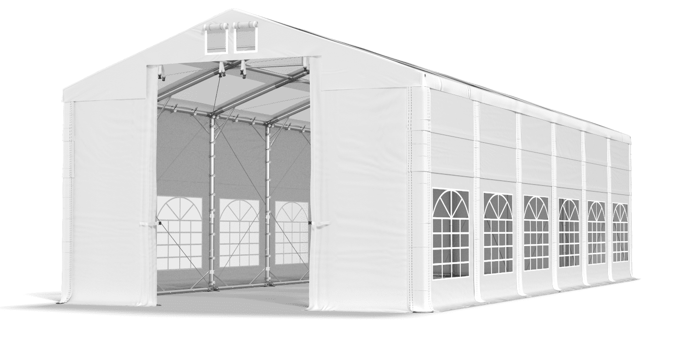 Ohýbanie okien s farebným sklom vyzerá elegantne a funguje skvele pri organizovaní rodinných a obchodných vonkajších večierkov. Priehľadná strecha zaručuje úplné osvetlenie stolov a buffínov. Plarka je plne odolná voči vlhkosti a UV žiareniu. Vďaka tomu zostáva interiér stanu večierku suchý. Oplachovanie bolo vybavené systémom ľahkej zmeny dĺžky Multi-size. Je to tiež vynikajúci záhradný stan a výstavný stan.