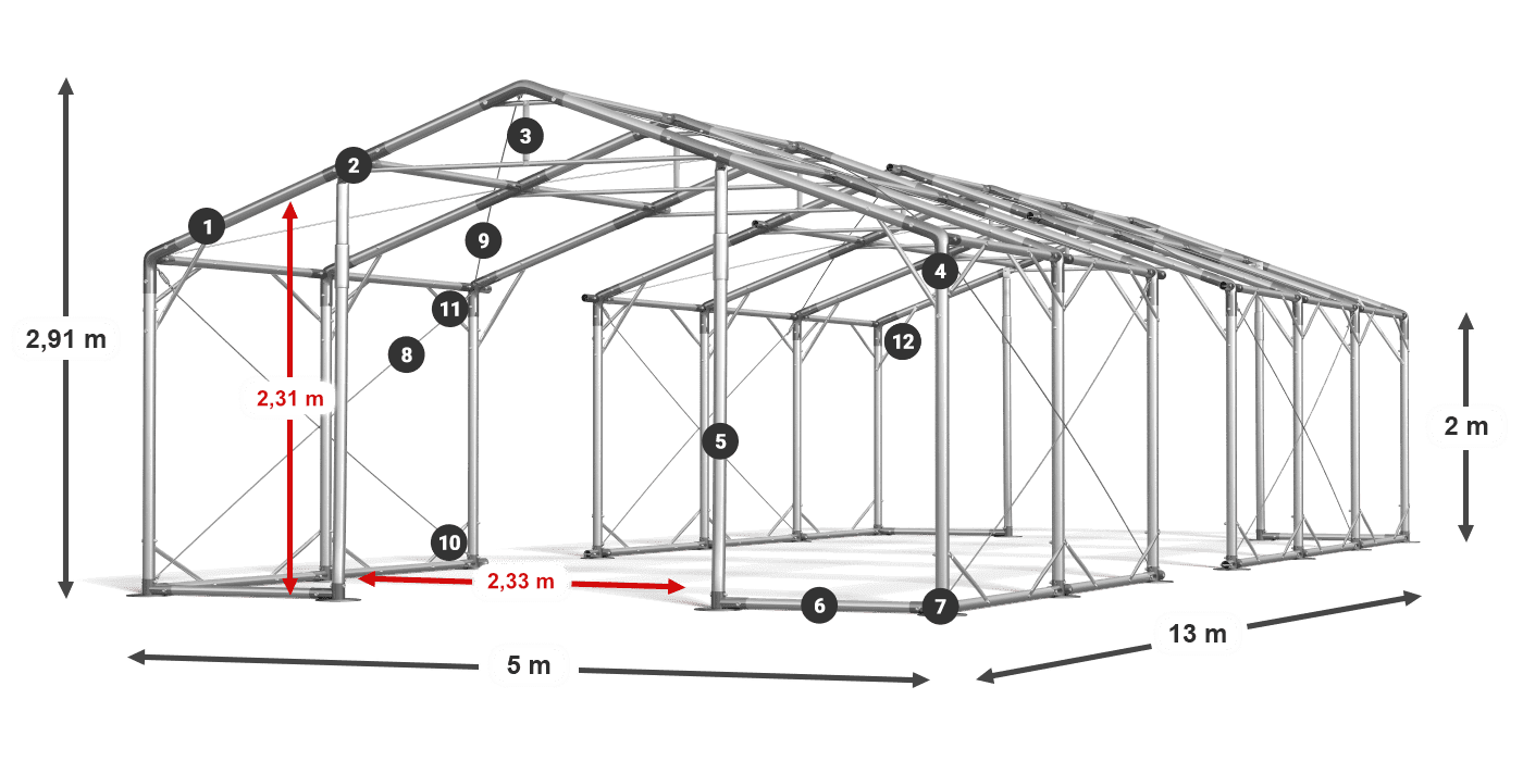 Výšky úložných a párty stanov je možné rýchlo meniť vďaka modulárnej konštrukcii, ktorá umožňuje zdvihnutie stanu o 0,5 m alebo 1 m. Najnižšia možná výška bočnej steny je 2m a najvyššia je 4m.