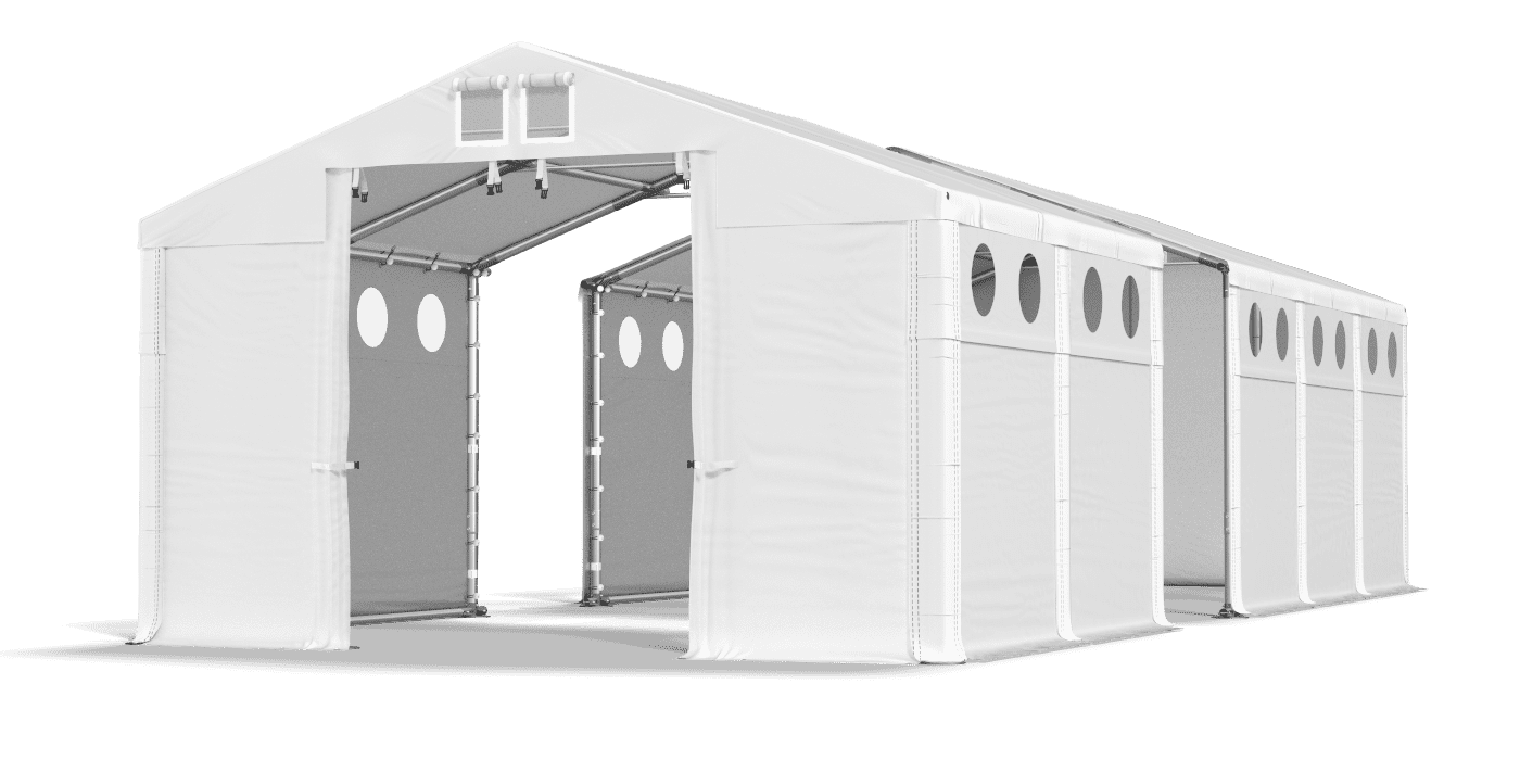 Plarka s malými okrúhlymi oknami zaisťuje prítok prirodzeného svetla do interiéru skladového stanu. Malé osvetľovacie okná sú umiestnené v hornej časti bočných stien. Vďaka tomu je interiér skladového stanu neviditeľný pre okoloidúci. Tesné a trvanlivé opláštenie je vyrobené zo silného, ​​nepremokavého PVC. Vďaka tomu môžeme ukladať stavebné materiály, náradie, plodiny, športové vybavenie, ako aj suroviny a komerčný tovar.