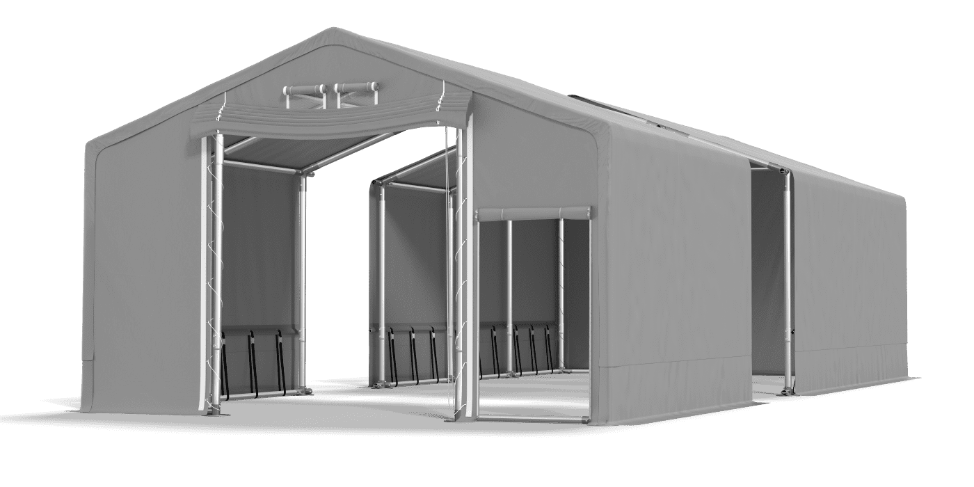Plná, šedá plachta vyrobená z PVC s vysokou hmotnosťou, dokonale izoluje tovar a atmosférické vozidlá uložené pod strechou. Silná, ročná plachta je vybavená ďalším menším vstupom, ktorý sa nachádza vedľa veľkej vstupnej brány. Je to vynikajúci úložný stan a pevný garážový stan. Vodotesné a tvrdé hýbajúce sa opláštenie vám umožňuje vykonávať dielňu a výrobné práce v stanovej sále.