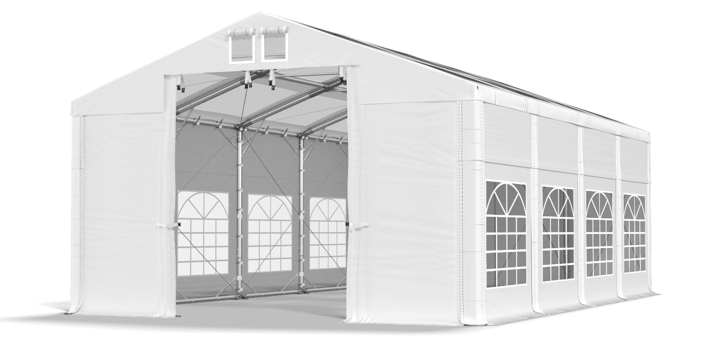 Plarka vybavenovaná oknami vitráže a priehľadnou strechou zaisťuje optimálne osvetlenie stolov a bufetov počas večierkov v večierku. Silné opláštenie s PVC chráni pred vlhkosťou, vetrom a UV žiarením. V prípade stanu môžete organizovať rodinné oslavy, bankety spoločnosti, festivaly a výstavy. Je to tiež vynikajúci záhradný stan a komerčný stan. Oplachovanie bolo vybavené systémom ľahkej zmeny dĺžky Multi-size.