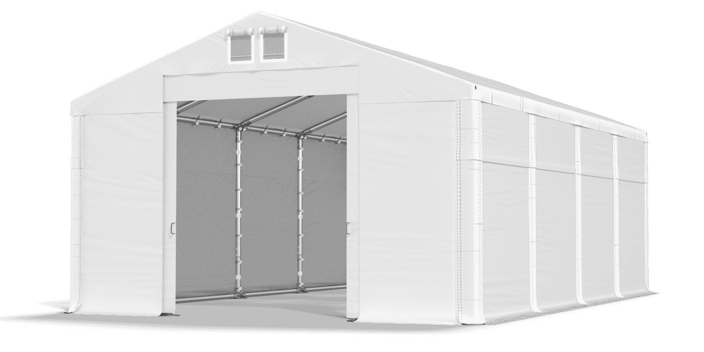 Odolný, tvrdý -tArpaulin tarpaulín z PVC poskytuje bezpečné podmienky na skladovanie stavebných materiálov, komerčných tovarov, vozidiel a poľnohospodárskych strojov. Plné opláštenie bez okien je mimoriadne tesné, vodotesné a neprechádza denným svetlom. Interiér skladového stanu je pre okoloidúci neviditeľný. Jedná sa o vynikajúci garážový stan a priemyselnú sieň. Plarpaulín má systém rýchlej zmeny dĺžky Multi-size.