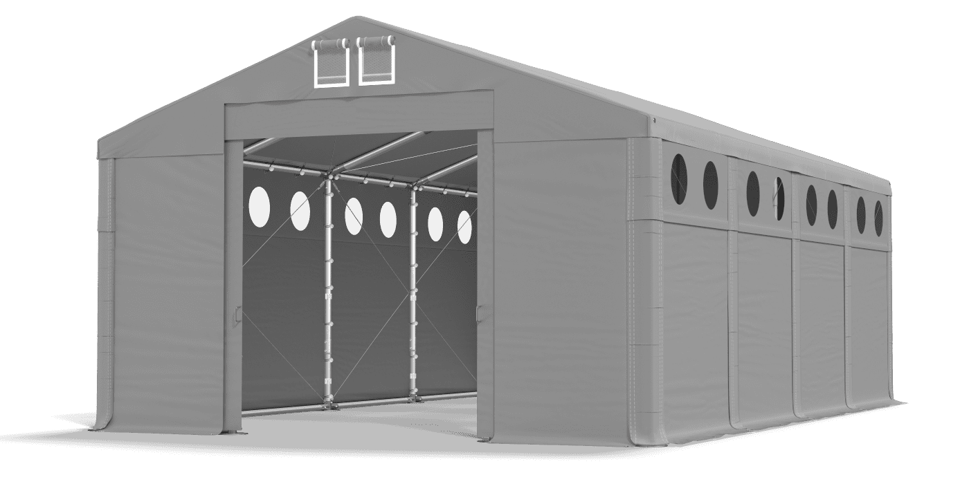 Opláchanie s okrúhlymi oknami je vyrobené zo silného PVC. Plarka je vodotesná, pevná a odolná voči UV žiareniu. V skladovom stane môžeme skladovať komerčné tovary, vozidlá, výnosy a stavebné materiály. Malé okná zabezpečujú interiér stanu. Sú umiestnené v hornej časti bočných stien, a preto je pre okoloidúci neviditeľný. Plarpaulín má systém rýchlej zmeny dĺžky Multi-size.