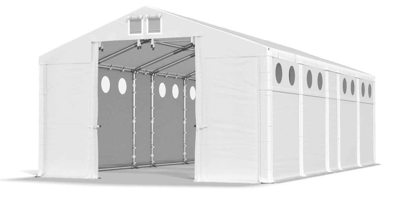 Oplátenie s osvetľujúcimi oknami zaručuje dodávku denného svetla do interiéru skladovacieho stanu. Pevná plachta PVC je odolná voči vlhkosti a UV žiareniu. Pod strechou môžete ukladať tovar, vykonávať opravy a vykonávať prácu súvisiace s výrobou a segregáciou. Oplachovanie bolo vybavené systémom ľahkej zmeny dĺžky Multi-size. Malé okrúhle okná sú umiestnené v hornej časti bočných stien, a preto je vnútorný garážový stan viditeľný pre okolostojacich.