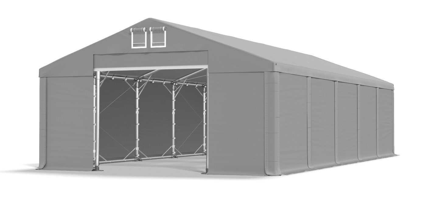Silná, plná plachta s PVC chráni obsah stanu pred znečistením a účinkom vlhkosti a UV žiarenia. Pevné opláštenie stanu skladu vám umožňuje skladovať tovar, garážové vozidlá. Šírka retenčná zástera zlepšuje odtok vody počas zrážok a dvojité ventilátory regulujú výmenu vzduchu. Plarka nemá žiadne okná, čo bráni stanu vonku.