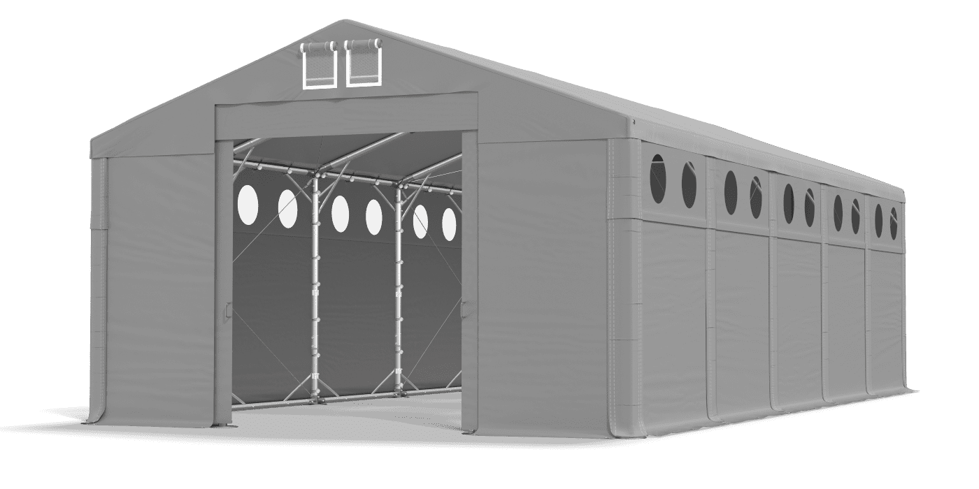Oplátenie s osvetľujúcimi oknami zaručuje dodávku denného svetla do interiéru skladovacieho stanu. Pevná plachta PVC je odolná voči vlhkosti a UV žiareniu. Pod strechou môžete ukladať tovar, vykonávať opravy a vykonávať prácu súvisiace s výrobou a segregáciou. Oplachovanie bolo vybavené systémom ľahkej zmeny dĺžky Multi-size. Malé okrúhle okná sú umiestnené v hornej časti bočných stien, a preto je vnútorný garážový stan viditeľný pre okolostojacich.