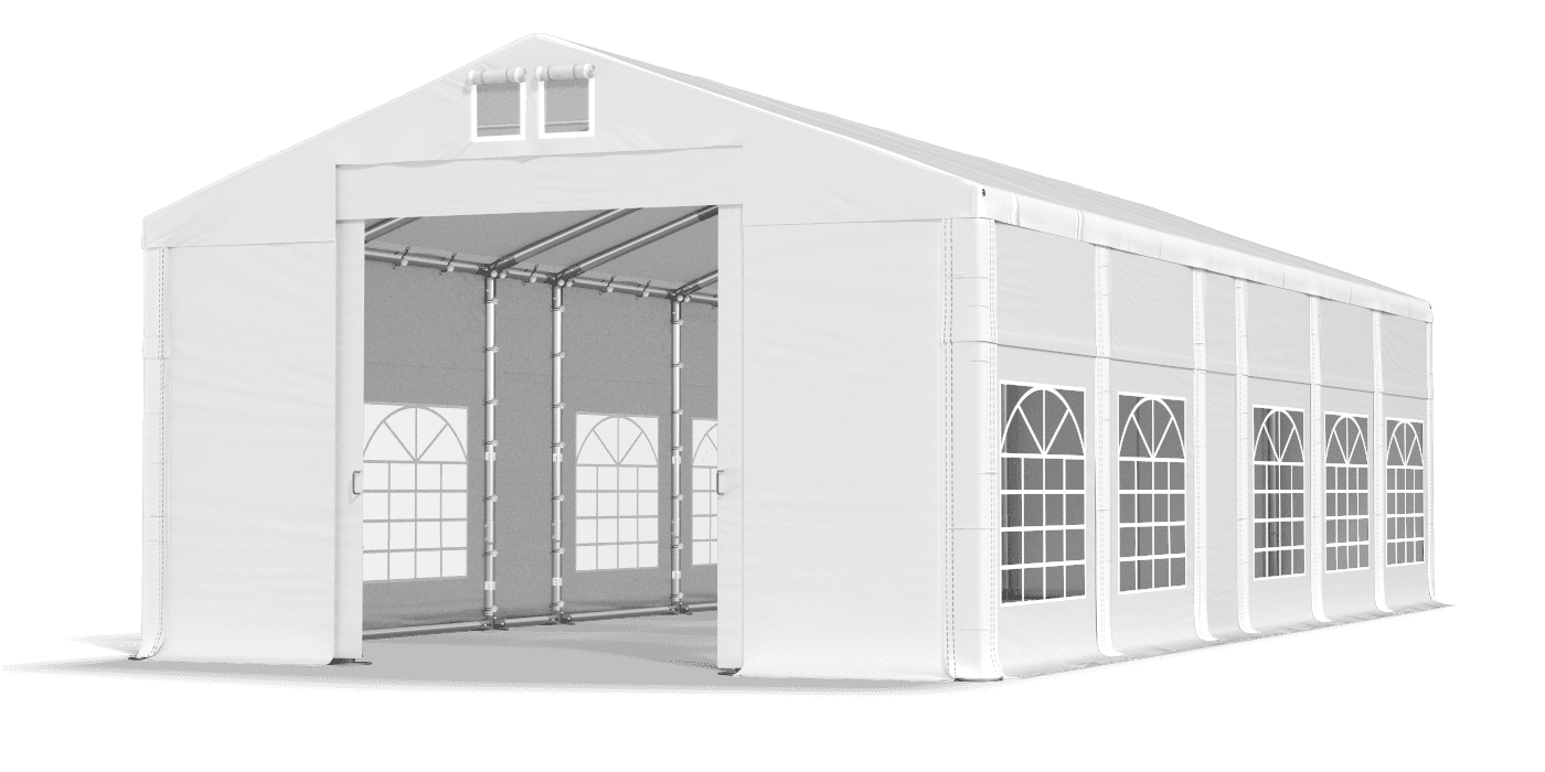 „Pevná plachta s oknami z farebného skla je vyrobená z vysokej hmotnosti PVC Služovanie je vodotesné a odolné voči UV žiareniu. Target stanu strany poskytuje suchý a tienistý priestor pre stoly, bufety a tanečný parket. „