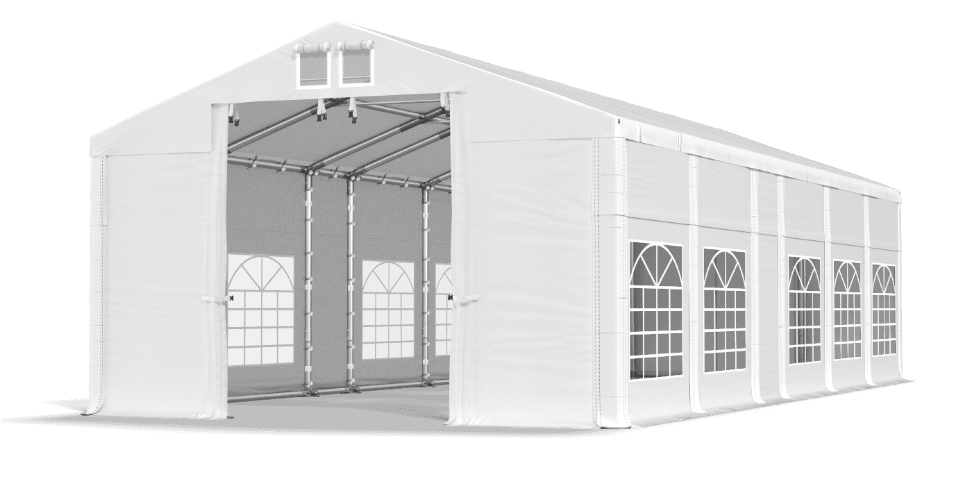 „Pevná plachta s oknami z farebného skla je vyrobená z vysokej hmotnosti PVC Služovanie je vodotesné a odolné voči UV žiareniu. Target stanu strany poskytuje suchý a tienistý priestor pre stoly, bufety a tanečný parket. „