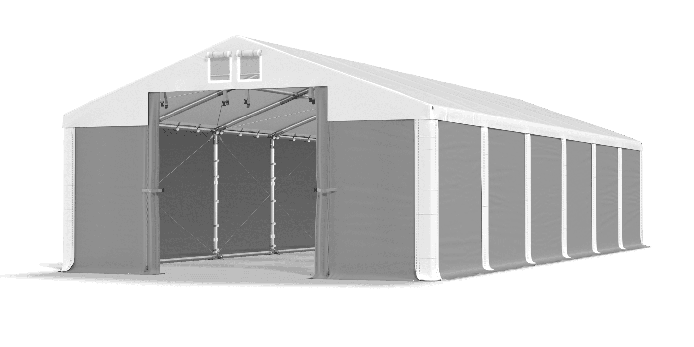 Odolný, tvrdý -tArpaulin tarpaulín z PVC poskytuje bezpečné podmienky na skladovanie stavebných materiálov, komerčných tovarov, vozidiel a poľnohospodárskych strojov. Plné opláštenie bez okien je mimoriadne tesné, vodotesné a neprechádza denným svetlom. Interiér skladového stanu je pre okoloidúci neviditeľný. Jedná sa o vynikajúci garážový stan a priemyselnú sieň. Plarpaulín má systém rýchlej zmeny dĺžky Multi-size.