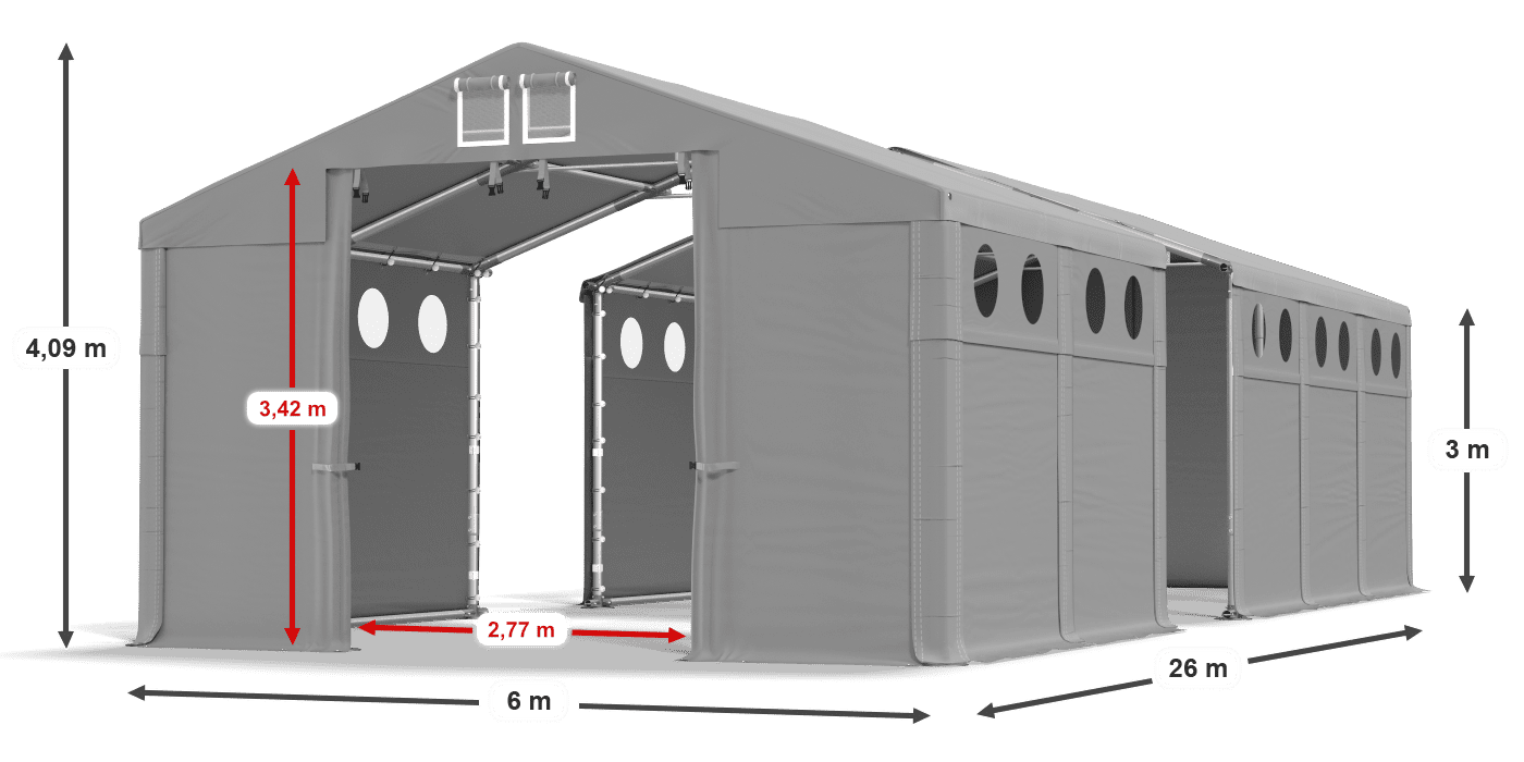 Plarka s okrúhlymi oknami s okrúhlym osvetlením poskytuje prirodzené svetlo vo vnútri stanu. Je vyrobený z PVC s vysokou hmotnosťou. Opláchanie je odolné voči vlhkosti a UV žiareniu, a preto poskytuje suchý a tienistý priestor na ukladanie tovaru, plodín, kŕmení a stavebných materiálov. Je to tiež vynikajúci garážový stan pre vozidlá, poľnohospodárske stroje a športové vybavenie. Interiér skladového stanu nie je viditeľný pre okoloidúci, pretože okná sú umiestnené v hornej časti bočných stien.