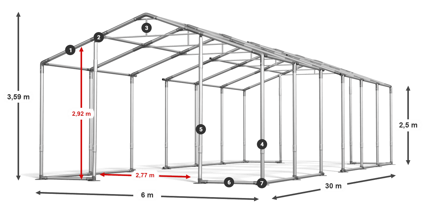 Stan 6m x30m 2,5m pozostáva zo stanov s rozmermi: 6x12m, 6x10m, 6x8m.