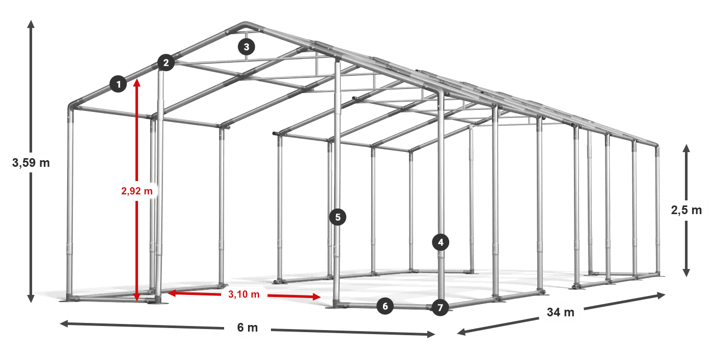 Stan 6m x34m 2,5m pozostáva zo stanov s rozmermi: 6x12m, 6x10m.