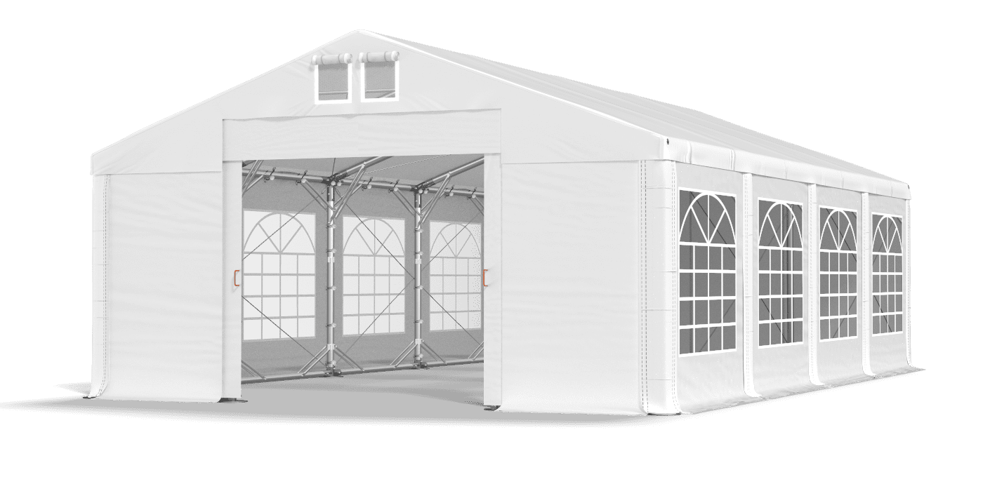 „Pevná plachta s oknami z farebného skla je vyrobená z vysokej hmotnosti PVC Služovanie je vodotesné a odolné voči UV žiareniu. Target stanu strany poskytuje suchý a tienistý priestor pre stoly, bufety a tanečný parket. „