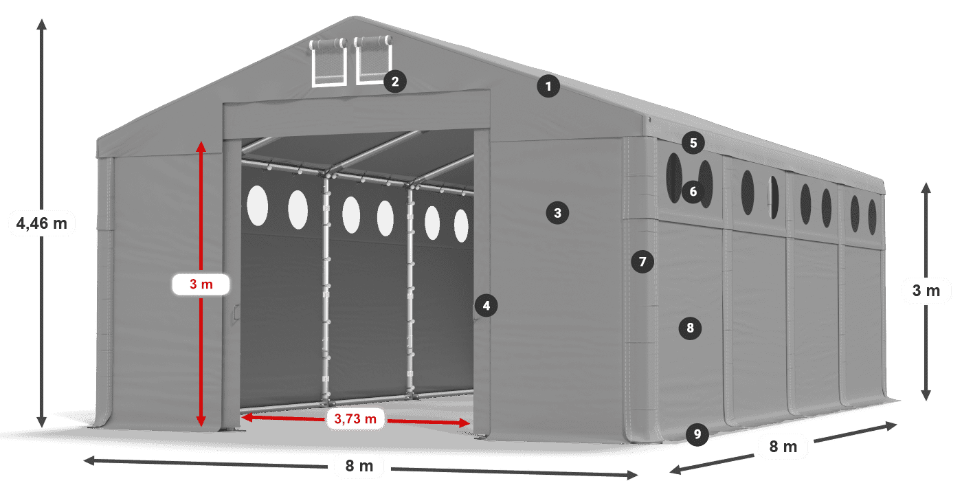 Silné opláštenie s osvetľujúcimi oknami umožňuje garáž vozidiel, skladovanie tovaru a vykonávanie prác týkajúcich sa montáže. Tvrdý -to -terpaulinný placht vyrobený z PVC je vodotesný, tesný a odolný voči UV žiareniu. V suchom a zatienenom skladovom stane môžeme skladovať plodiny, stavebné materiály a suroviny. Okná okrúhle osvetlenie poskytujú prirodzené svetlo. Plarpaulín má systém rýchlej zmeny dĺžky Multi-size.