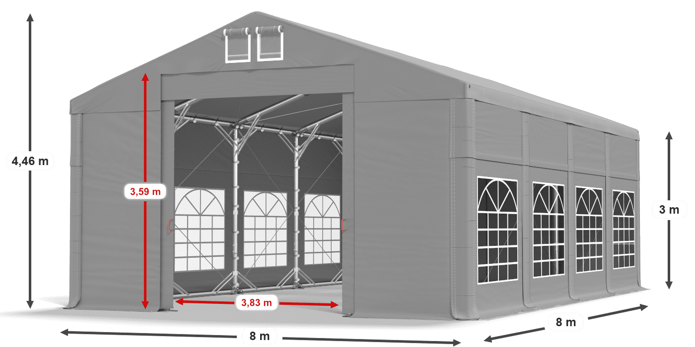 Bočná stena je vyrobená z hrubej plachty PVC cca. 500 g/m2 a veľké vitráže. Výška základnej steny je 2m. Vďaka unikátnemu dizajnu je možné jednoducho zdvihnúť bočnú stenu o 0,5 m alebo 1 m. Vďaka oknám umiestneným na každom dvojmetrovom segmente pôsobí stan esteticky. Skvele sa hodí ako komerčný, výstavný alebo párty stan.