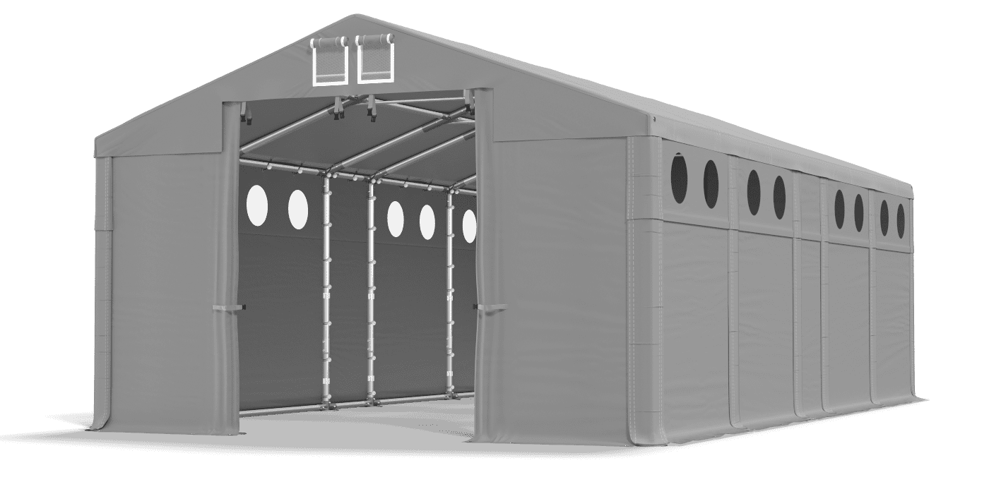 Oplátenie s osvetľujúcimi oknami zaručuje dodávku denného svetla do interiéru skladovacieho stanu. Pevná plachta PVC je odolná voči vlhkosti a UV žiareniu. Pod strechou môžete ukladať tovar, vykonávať opravy a vykonávať prácu súvisiace s výrobou a segregáciou. Oplachovanie bolo vybavené systémom ľahkej zmeny dĺžky Multi-size. Malé okrúhle okná sú umiestnené v hornej časti bočných stien, a preto je vnútorný garážový stan viditeľný pre okolostojacich.