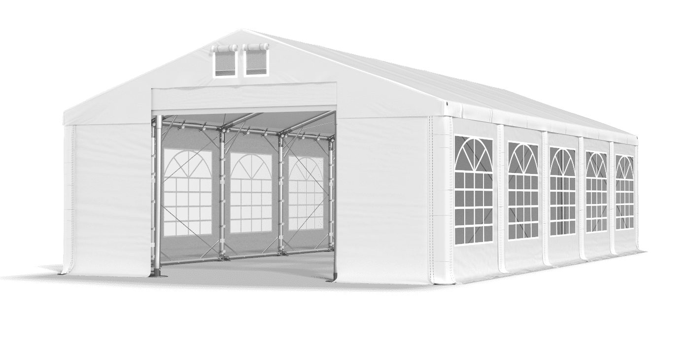 Silná plachta je vyrobená z PVC s vysokou hmotnosťou. Má estetické okná z farebného skla, ktoré poskytujú veľa denného svetla. Elegantné opláštenie sa používa v párty, gastronomických stanoch a obchodných stanoch. Vodotesná a UV -rezistentná plachta chráni stoly a bufety a pre hostí poskytuje suchý a tienistý priestor. Stan s oknami z farebného skla je tiež vynikajúci záhradný altánok.