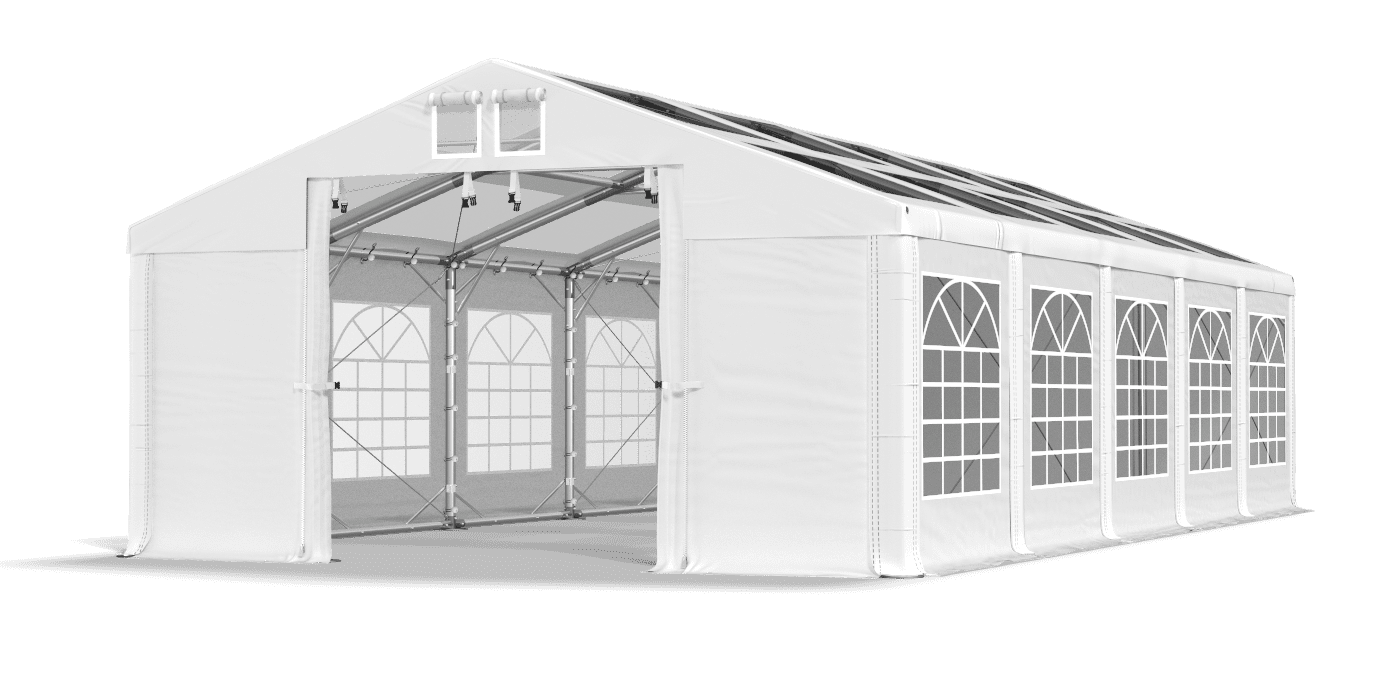 Plarka vybavenovaná oknami vitráže a priehľadnou strechou zaisťuje optimálne osvetlenie stolov a bufetov počas večierkov v večierku. Silné opláštenie s PVC chráni pred vlhkosťou, vetrom a UV žiarením. V prípade stanu môžete organizovať rodinné oslavy, bankety spoločnosti, festivaly a výstavy. Je to tiež vynikajúci záhradný stan a komerčný stan. Oplachovanie bolo vybavené systémom ľahkej zmeny dĺžky Multi-size.
