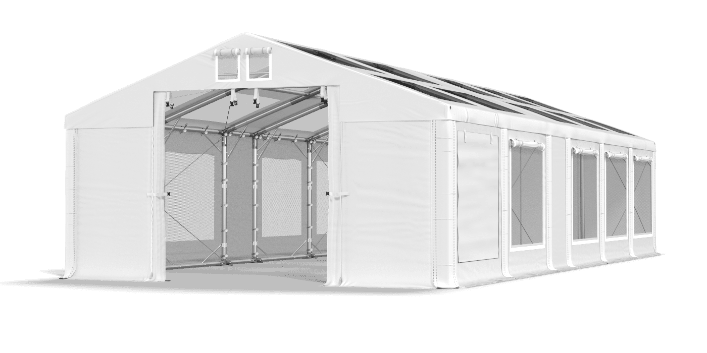 Plarpaulín vybavený siete komárom je extrémne vzdušný a súčasne chráni stoly a bufety pred lietajúcim hmyzom. Transparentná strecha zaručuje úplné osvetlenie interiéru stanu strany. Ohýbanie je vyrobené z trvanlivého PVC s vysokou hmotnosťou. Je vodotesný, tesný a odolný voči UV žiareniu. Vďaka tomu môžu byť vonkajšie večierky, rodinné pikniky a podujatia spoločnosti zorganizované v stane podujatia. Oplachovanie bolo vybavené systémom ľahkej zmeny dĺžky Multi-size.
