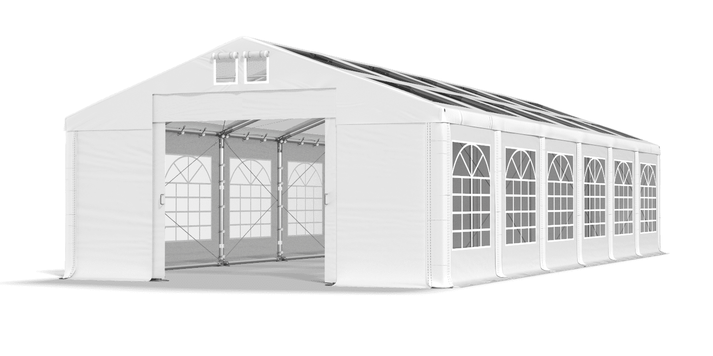 Plarka vybavenovaná oknami vitráže a priehľadnou strechou zaisťuje optimálne osvetlenie stolov a bufetov počas večierkov v večierku. Silné opláštenie s PVC chráni pred vlhkosťou, vetrom a UV žiarením. V prípade stanu môžete organizovať rodinné oslavy, bankety spoločnosti, festivaly a výstavy. Je to tiež vynikajúci záhradný stan a komerčný stan. Oplachovanie bolo vybavené systémom ľahkej zmeny dĺžky Multi-size.