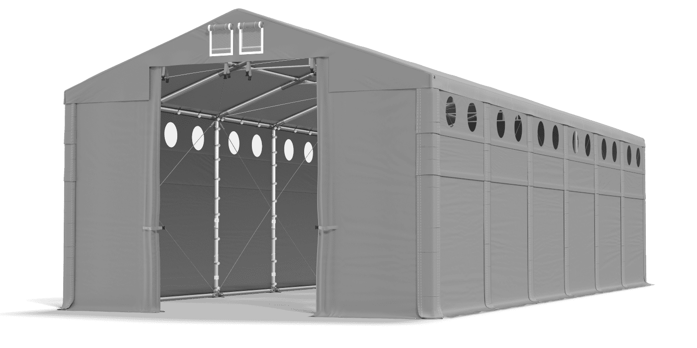 Opláchanie s okrúhlymi oknami je vyrobené zo silného PVC. Plarka je vodotesná, pevná a odolná voči UV žiareniu. V skladovom stane môžeme skladovať komerčné tovary, vozidlá, výnosy a stavebné materiály. Malé okná zabezpečujú interiér stanu. Sú umiestnené v hornej časti bočných stien, a preto je pre okoloidúci neviditeľný. Plarpaulín má systém rýchlej zmeny dĺžky Multi-size.