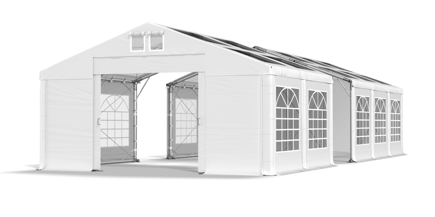 Plarka vybavenovaná oknami vitráže a priehľadnou strechou zaisťuje optimálne osvetlenie stolov a bufetov počas večierkov v večierku. Silné opláštenie s PVC chráni pred vlhkosťou, vetrom a UV žiarením. V prípade stanu môžete organizovať rodinné oslavy, bankety spoločnosti, festivaly a výstavy. Je to tiež vynikajúci záhradný stan a komerčný stan. Oplachovanie bolo vybavené systémom ľahkej zmeny dĺžky Multi-size.